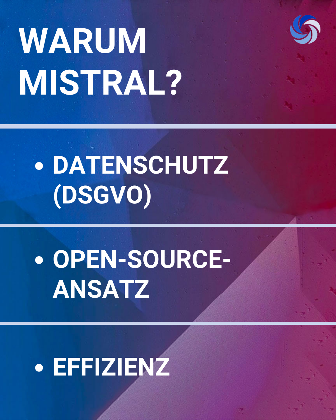Mistral AI ist eine europäische Alternative zu ChatGPT. Da Mistral viele Modelle als Open-Source zur Verfügung stellt, können Unternehmen die KI auf eigenen Servern betreiben. So verlassen sensible Firmendaten niemals den eigenen Rechtsraum und die volle Datensouveränität bleibt gewahrt.